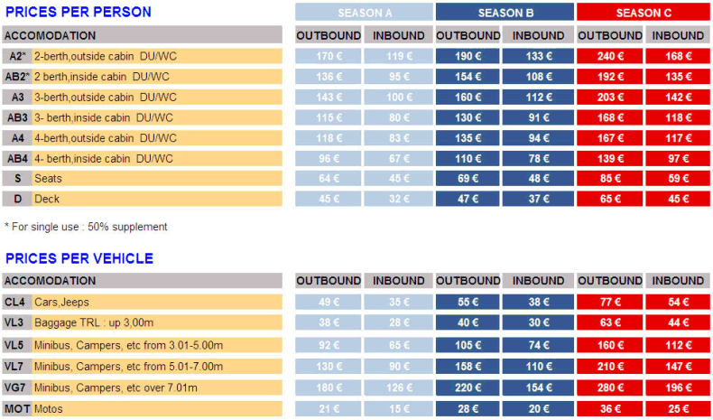 Prezzi EURO, per persona, veicolo e tratta