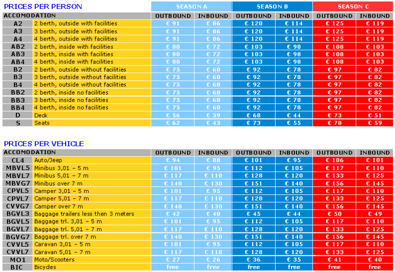 Prezzi EURO, per persona, veicolo e tratta
